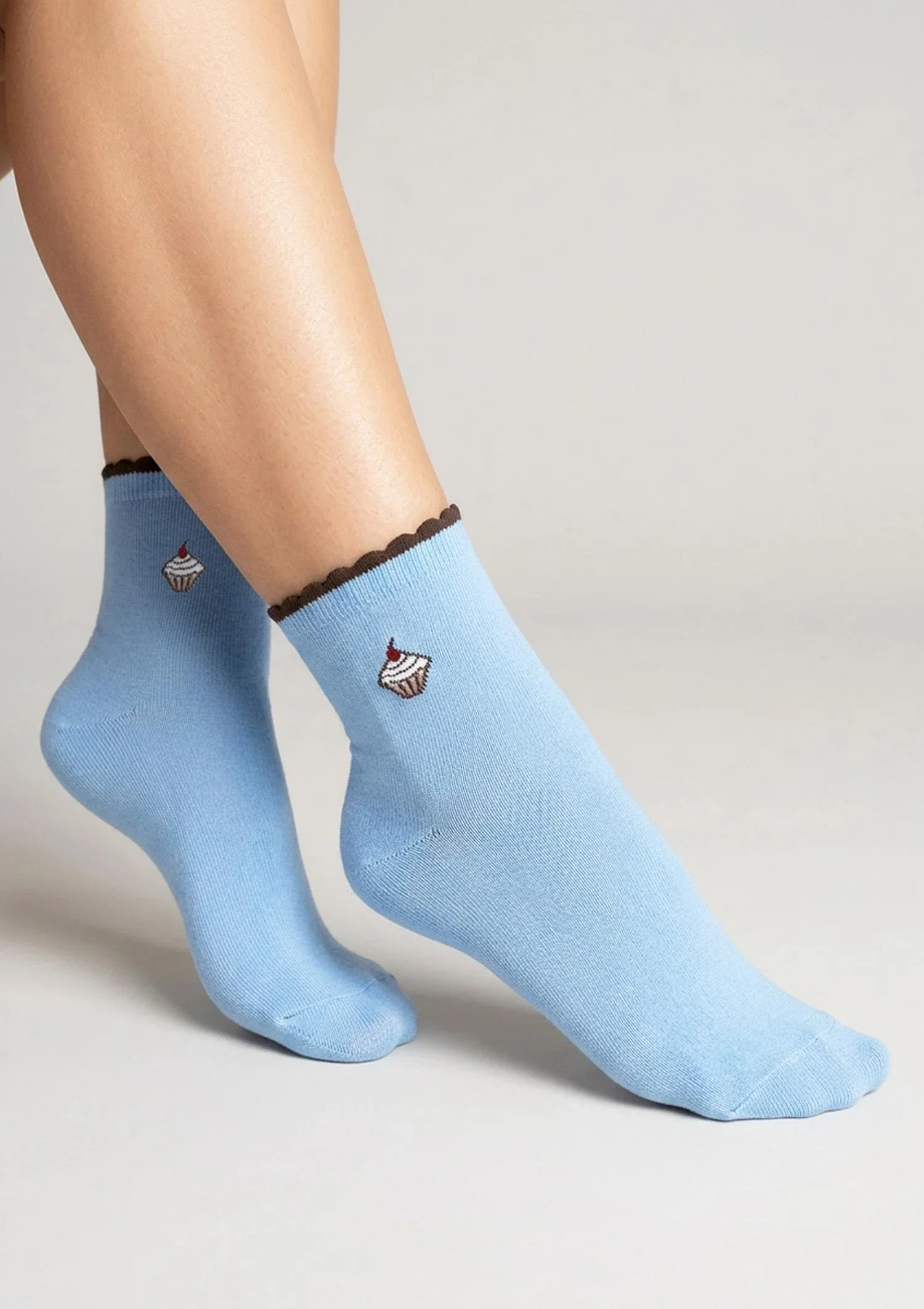 Cotton socks Scp Cupcake combine everyday wearing comfort with a charming, dessert-inspired detail. The smooth, light blue knit has been decorated with an embroidered cupcake motif, giving the whole design a light, sweet and relaxed character. The contrasting, wavy finish at the cuff in a dark colour subtly breaks up the pastel base and adds a girlish accent to the model. On the sole of the foot there is an embroidered Marilyn inscription, highlighting the branded detail of the product. This is a soft, comfortable style for everyday wear, bringing a touch of colour and playful charm to any outfit.