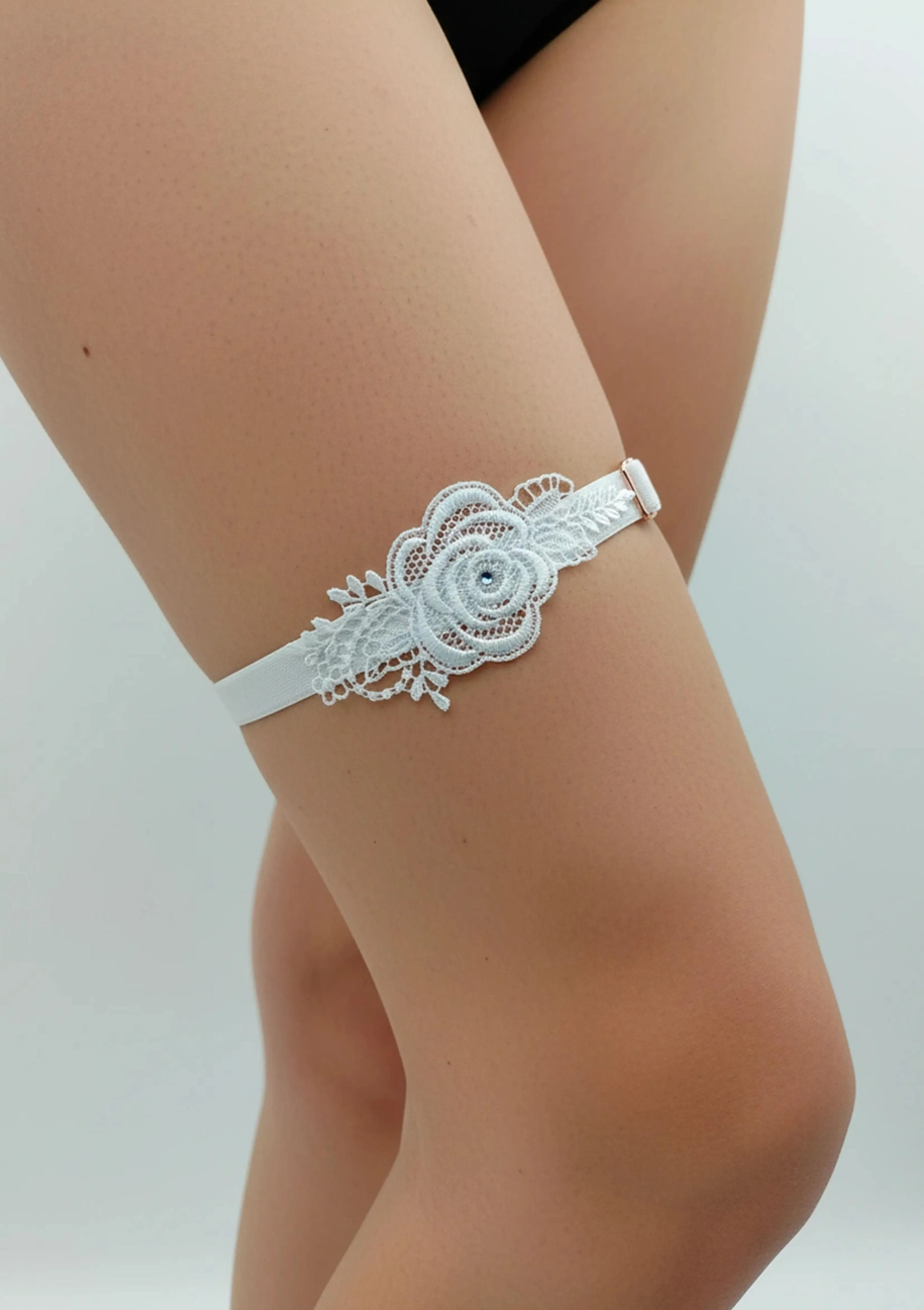 Garter Lili is a sensual accessory that combines the delicacy of satin with a distinctive floral embroidery. The soft band embraces the thigh, while the intricately stitched motif with a shimmering crystal in the centre draws the eye with its subtle glow. The adjustable strap allows the garter to be perfectly fitted to the circumference, ensuring it stays securely in place while maintaining lightness and comfort. It is a feminine detail that complements both bridal lingerie and evening outfits.