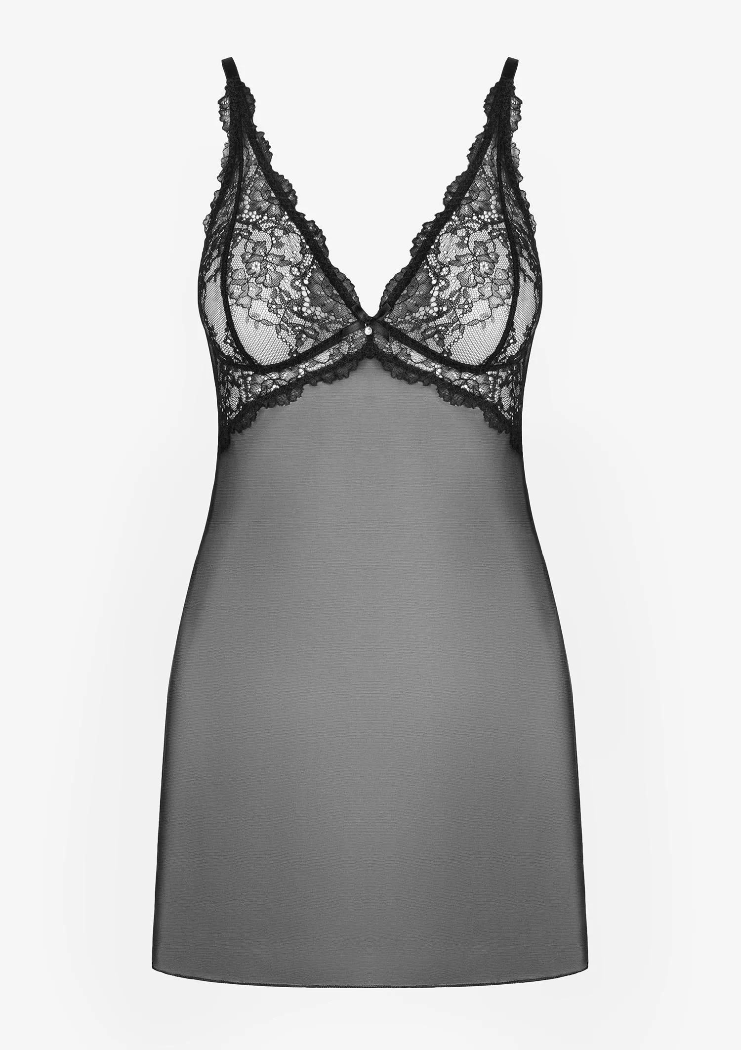 Elvire chemise is a combination of light sensuality and elegance, creating a unique whole. The cups made of transparent lace in a floral pattern beautifully accentuate the bust line, with delicate frills adorning the edges. Between the cups, a small bow with a sparkling rhinestone catches the eye with its jewellery-like accent. The bottom of the chemise is made of semi-transparent tulle, softly flowing around the silhouette and giving lightness to the entire form. Adjustable straps allow the chemise to be fitted to the body, ensuring wearing comfort. This design combines the finesse of lace with the airiness of tulle, creating lingerie with an alluring character.