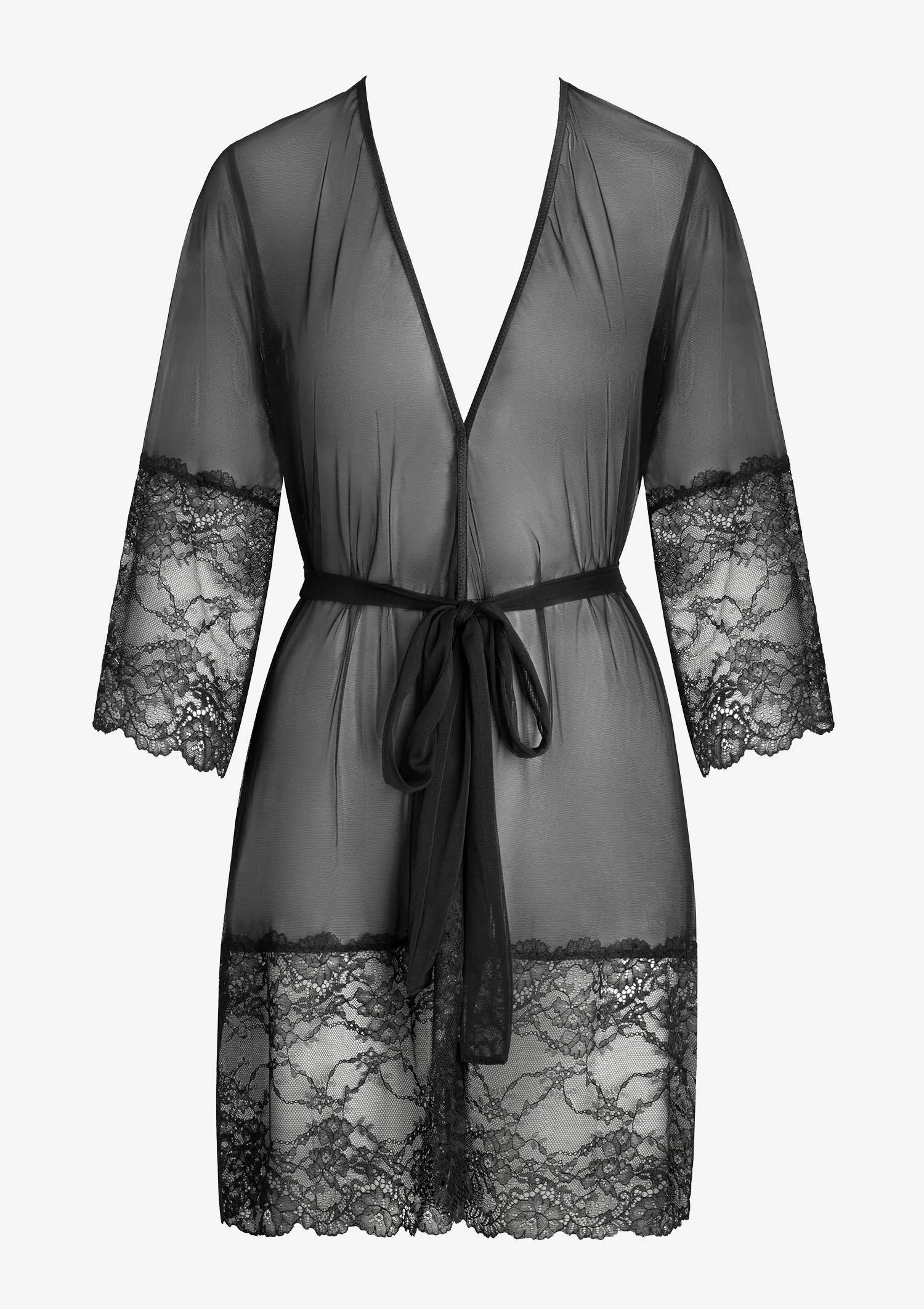 Elvire robe is a sensual complement to women’s night lingerie, combining the lightness of tulle with the finesse of lace. The transparent fabric embraces the silhouette, while the wide cuffs and hem finished with floral lace add an elegant character. The waist tie allows you to accentuate your curves and adjust the fit to the body. The airy fabric gives the design lightness while creating an aura of mystery and seductive charm. Perfectly matched with the chemise or lingerie from the same line, it creates a complete and striking set.