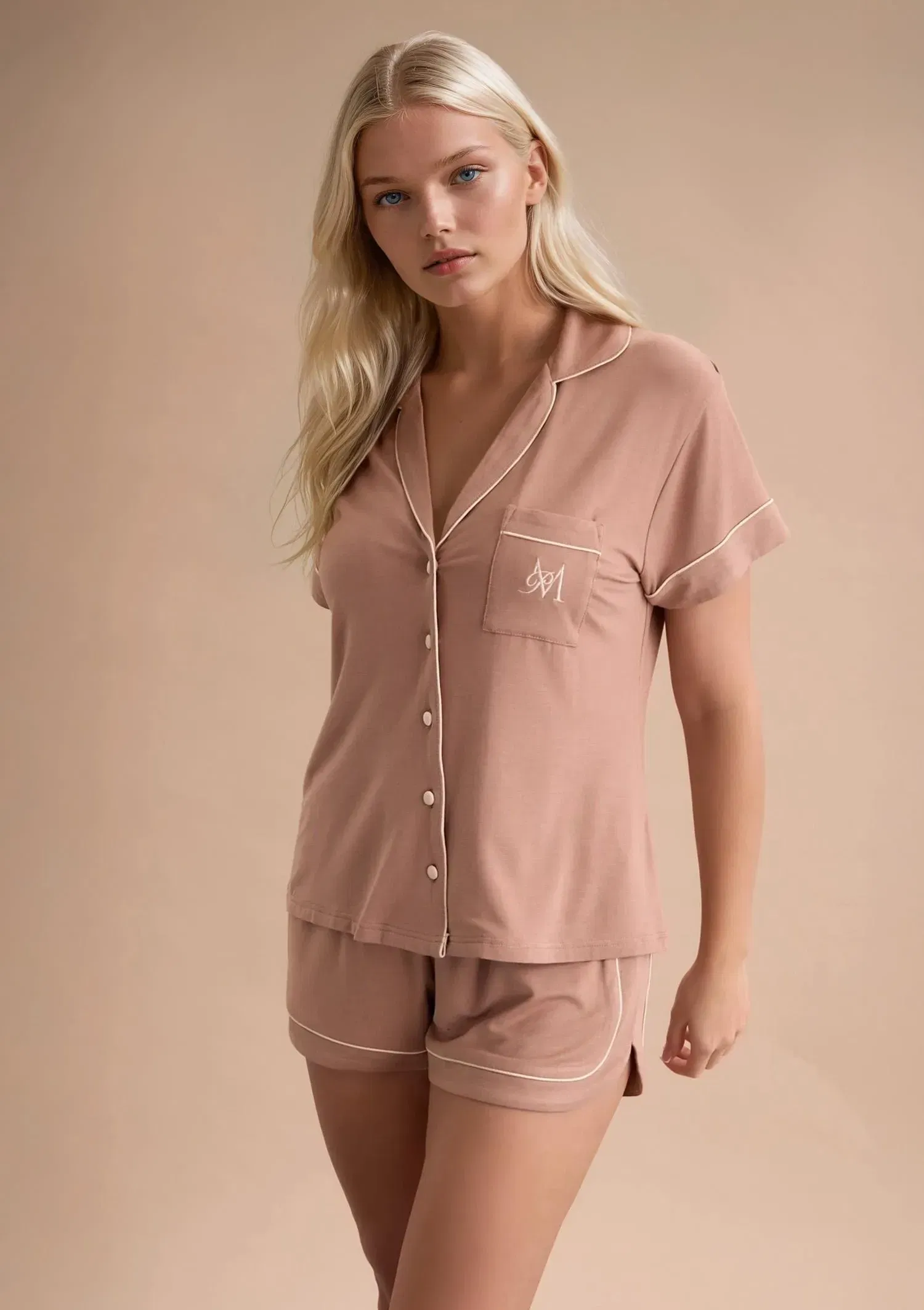 The Hannah short-sleeved pyjama top combines a classic look with exceptional comfort, perfect for evening relaxation and a restful night’s sleep. Made from high-quality modal, known for its remarkable softness and breathability, it gently wraps the skin and keeps a pleasant feeling of freshness throughout the night. The classic cut with a collar and cream piping adds a timeless character, while the loose fit ensures freedom of movement. The button fastening and chest pocket provide a practical finish. Modal, derived from cellulose fibres, is skin-friendly, non-irritating, and performs excellently in everyday wear.