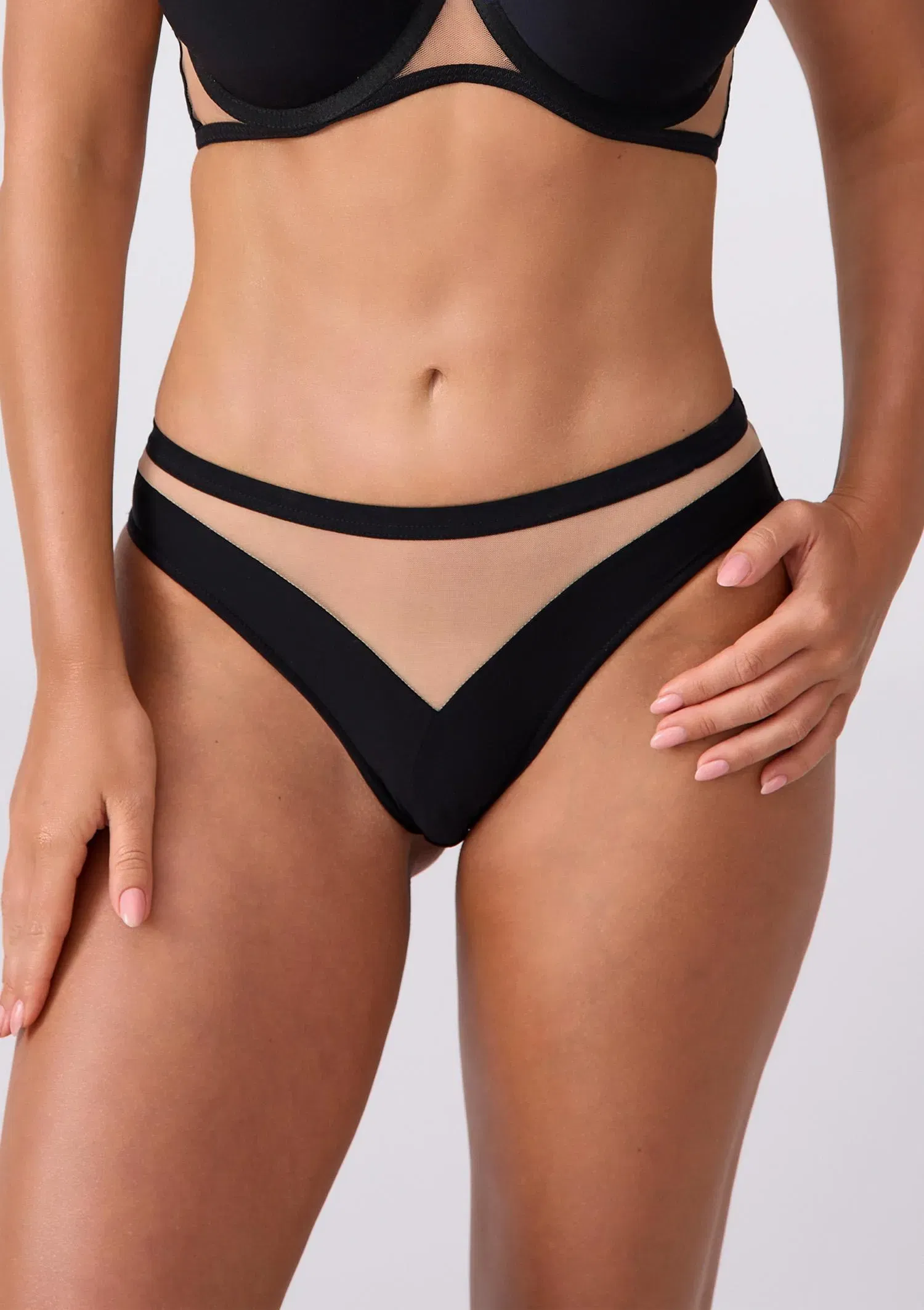 Briefs with a minimalist, futuristic design. The front features a V-shaped cut created by combining black fabric with nude tulle, visually elongating the legs and accentuating the silhouette. The back is made of tulle and elastic fabric — the fabric layer is wrapped in tulle, creating a smooth, seamless finish that doesn’t press or show under clothing. A soft waistband and delicate leg openings provide comfort. Cotton gusset for everyday wear.