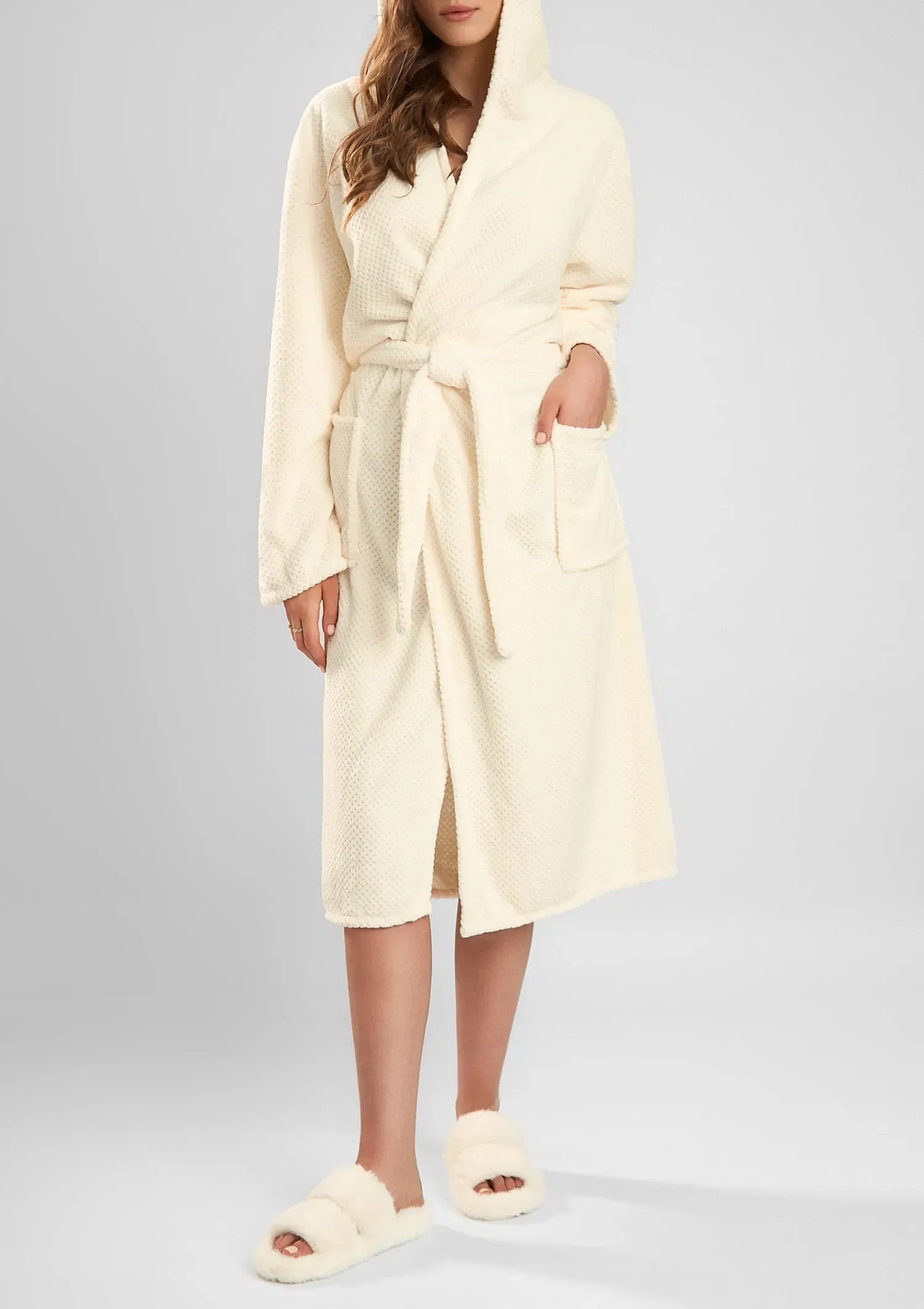 Comfort dressing gown is the perfect combination of softness and practical design, making everyday relaxation truly special. Made from fluffy knit fabric with a delicate texture, it gently wraps the body with pleasant warmth, creating a sense of complete comfort. The hood adds cosiness while protecting against the cold on chilly mornings and evenings. A tie belt at the waist allows the fit to be adjusted and accentuates natural body lines, while practical pockets give the piece a functional touch. The knee-length cut makes this gown both comfortable and versatile – ideal after a bath or for relaxing at home.